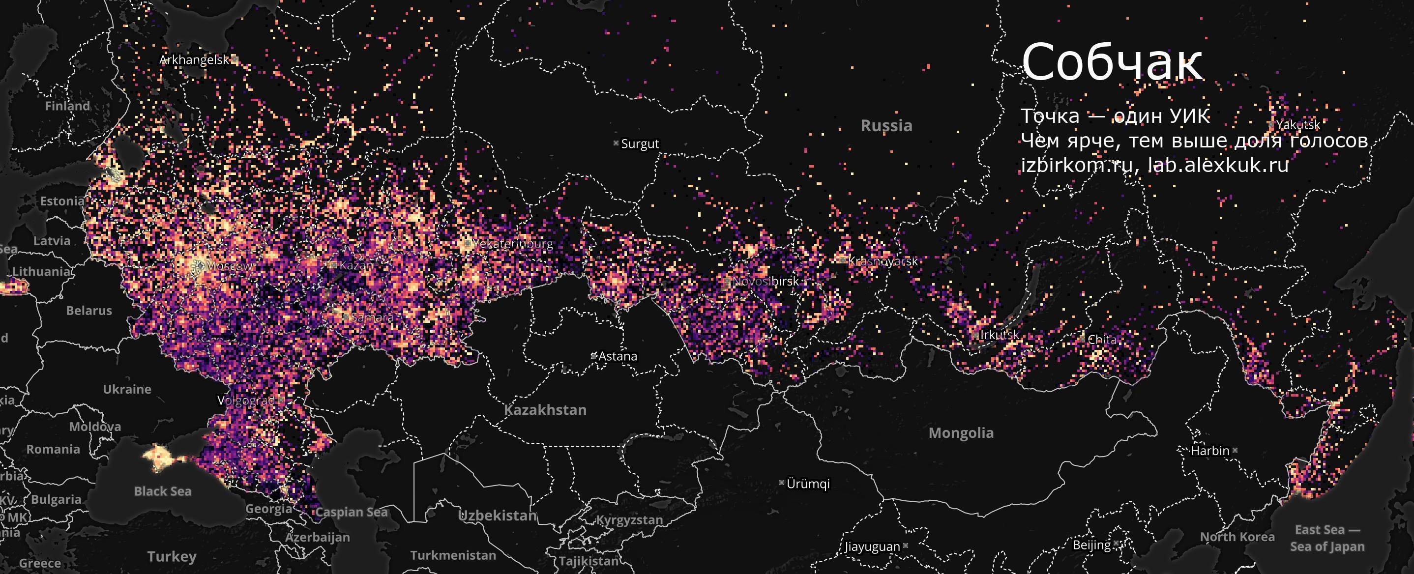 География голосования за Собчак еще интереснее. Хотя общее число небольшое, но его максимумы видны невооруженным глазом: это запад России, все крупные агломерации, а также отдельные участки на Северном Кавказе и Крым.