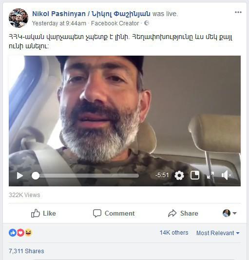 Еще на эту тему. На пост Карена Карапетяна о том, что он не уходит в отставку, отреагировало почти 5.9 тысяч человек. На пост Никола Пашиняна о том, что никто из РПА не должен быть премьер-министром отреагировало не менее 14.5 тыс. человек. Соотношение 2.5 к 1. Особенно учитывая, что и в посте Карена Карапетяна далеко не все были рады его решению.