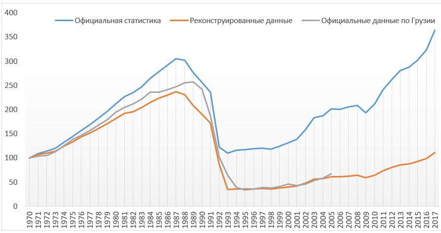 Итак, по официальным данным производство промышленной продукции в Армении уже должно было превысить наивысший уровень производства в Советской Армении на 20%. Нет необходимости долго распространяться о том, почему это не так – почти ни один натуральный показатель производства продукции не восстановился, не восстановилось производство электроэнергии, а также гигантские промышленные кластеры, находящиеся в разных городах Армении. Грузинские данные неплохо согласовываются с моей реконструкцией, также, как и производство электроэнергии (см. график 1). С производством электроэнергии тоже не все чисто, но сейчас нет необходимости уходить так далеко.
