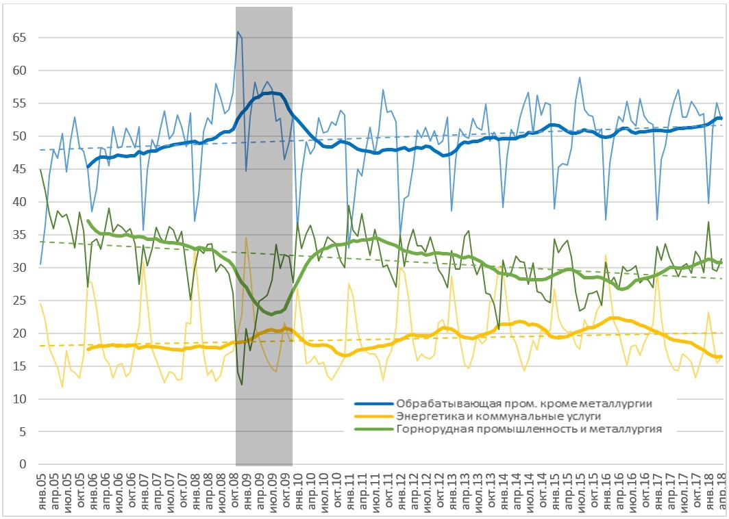 В график включено два тренда, прерывистой линией показан линейный тренд, а жирной линией – линейная фильтрация, усредняющая динамику за 12 месяцев. Как видно на графике выше, структура промышленности имеет отчетливую сезонность – обрабатывающая промышленность сокращается в зимние месяцы, что связано со снижением производства строительных материалов и пищевой промышленности, соответственно рост имеет энергетика и коммунальные услуги по понятным причинам. Обрабатывающая промышленность показала резкий рост во время кризиса, но этот рост зафиксирован лишь в структуре производства, а не в объемах. В остальном, есть устойчивая тенденция роста доли обрабатывающей промышленности во всей промышленности. Таким образом, определяющим фактором роста объемов промышленного производства является именно обрабатывающая промышленность, в частности, легкая и пищевая. Добывающая же в целом имеет тенденцию к понижению, в частности, этот тренд был очень выраженным с 2011 по 2016 гг., а в 2016-2018 гг. несколько обернулся вспять.