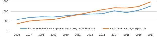 Информация о количестве въезжающих в Армению посредством авиации. Это количество хорошо коррелирует с числом въезжающих туристов, что, конечно, логично, хотя не стоит забывать, что не все въезжающие являются туристами (примерно половина – граждане Армении) – и не все туристы въезжают в страну через воздушные ворота. Тем не менее, на ежегодном уровне корреляция между числом туристов и числом въезжающих посредством авиации высока: 0.97.