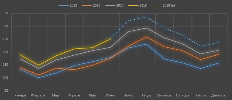 Если смотреть на статистику авиаперевозок более детально, то можно увидеть несколько вещей. Как я уже сказал, в июне подрос пассажиропоток. На графике это выглядит так.