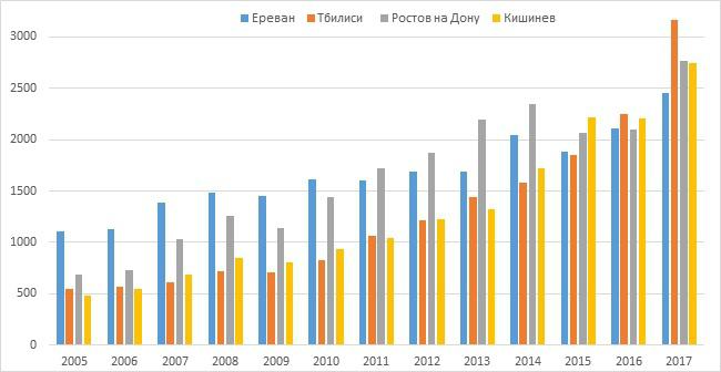 За последние несколько лет тбилисский аэропорт сильно прибавил и вышел на первое место среди всех четырех, представленных здесь, тогда как вплоть до 2012 года был последним или одним из последних. Два года назад была открыта новая ВПП, благодаря которой он стал принимать больше взлетов и посадок[7]. В прошлом году был отремонтирован и перестроен терминал – само здание аэропорта. Пассажиропоток через Ереванский аэропорт за 12 лет вырос на 120%; через Тбилисский – на 478% и сейчас он превышает 3 млн пассажиров в год. Скорее всего, пассажиропоток через «Звартноц» за 2018 год составит 2.7 млн пассажиров, а весь пассажиропоток аэропортов Армении – до 2.9 млн.