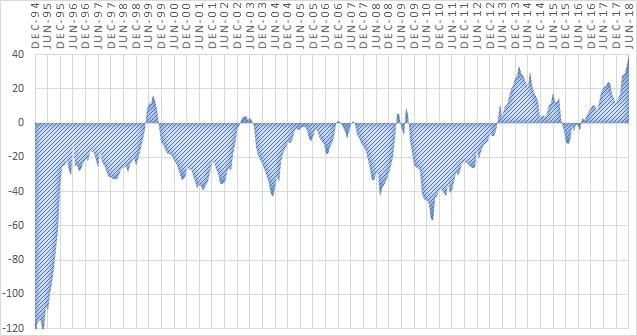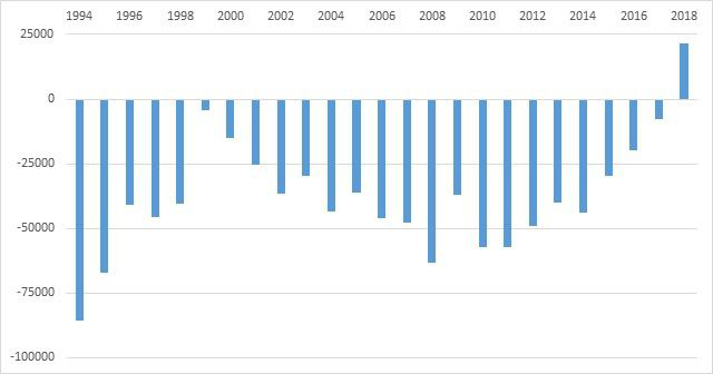 4. Сальдо трансграничного пассажиропотока через аэропорты Армении за первые полгода, 1994-2018.