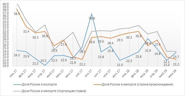 График 3. Доля России во внешней торговле Армении, 2017-2018