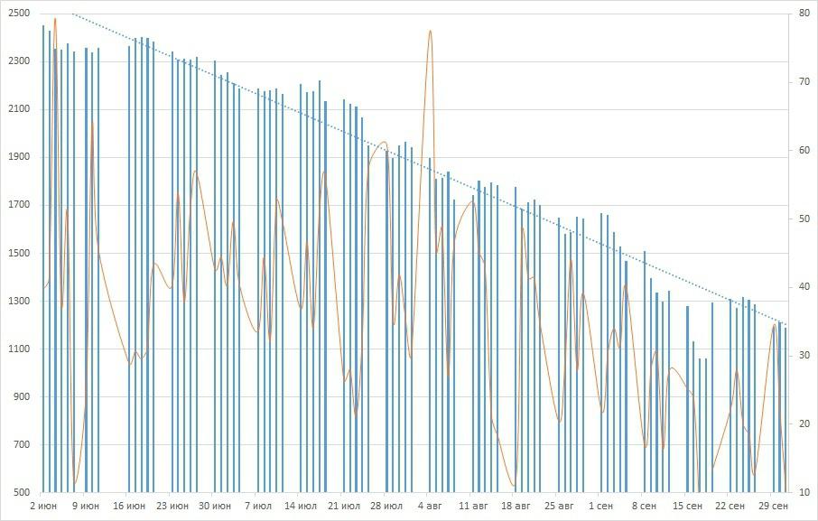 (оранжевая линия - торги, правая шкала, синий столбец - значение индекса, левая шкала).