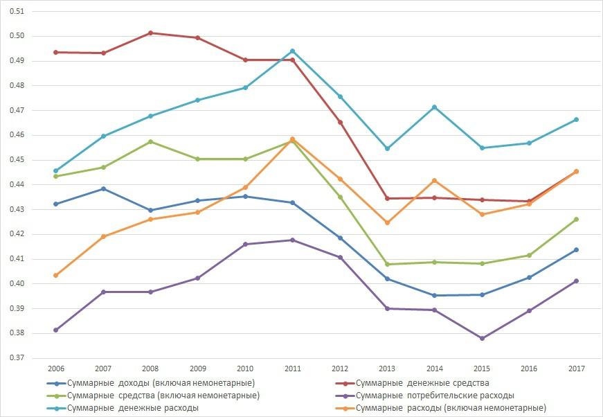 Пример по Грузии достаточно красноречив. В то время как экономика растет, растет и неравенство, что приводит к снижению темпов роста медианных доходов по сравнению со средними. И если самым высоким в Грузии был уровень неравенства в конце 2011 года, то в 2012-2013 гг. он заметно сократился вследствие смены правительства и экономической политики, тогда как в 2016-2017 гг. виден заметный рост неравенства. Данные представлены на графике ниже. Это индекс Gini, где более высокий индекс означает более высокий уровень неравенства.