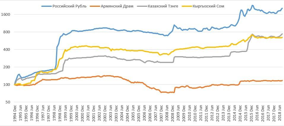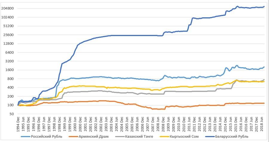 В качестве бонуса предлагаю посмотреть на график динамики стоимости валют стран ЕАЭС на протяжении последних 23 лет (с декабря 1994 года, когда везде завершилась гиперинфляция).