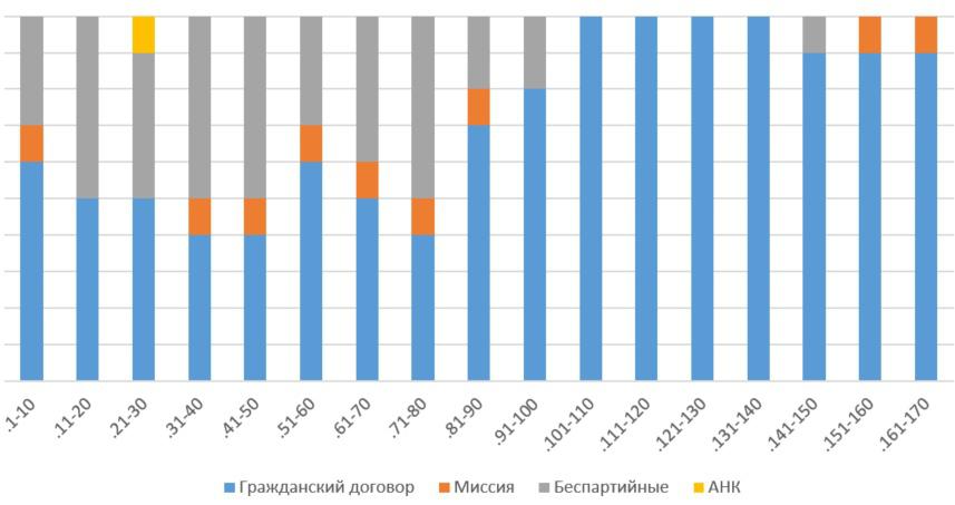 В списке 121 член «Гражданского договора», 9 членов «Миссии», 39 беспартийных и 1 член АНК. В действительности, членов АНК больше, но некоторые выступили как беспартийные. Что же касается беспартийных, то по графику видно, что в функциональной части списка, до 80 места, их число гораздо выше. Среди первых 80, члены «Гражданского договора» занимают 39 мест, члены «Миссии» - 6 мест, а беспартийных и членов АНК – 35. Так что это в некотором роде подобие «Блока коммунистов и беспартийных», в который превращается каждая правящая партия. Очевидно, что партийный актив находится в верхней половине списка, тогда как большое количество членов «Гражданского договора» в нижней части списка – это вступившие в партию после революции и не являющиеся сколько-либо существенной ее частью.