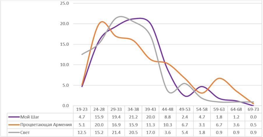 График 8. Распределение членов списков «Мой Шаг», «Процветающая Армения», «Луйс» по возрасту, доля в процентах, по 5-летним группам