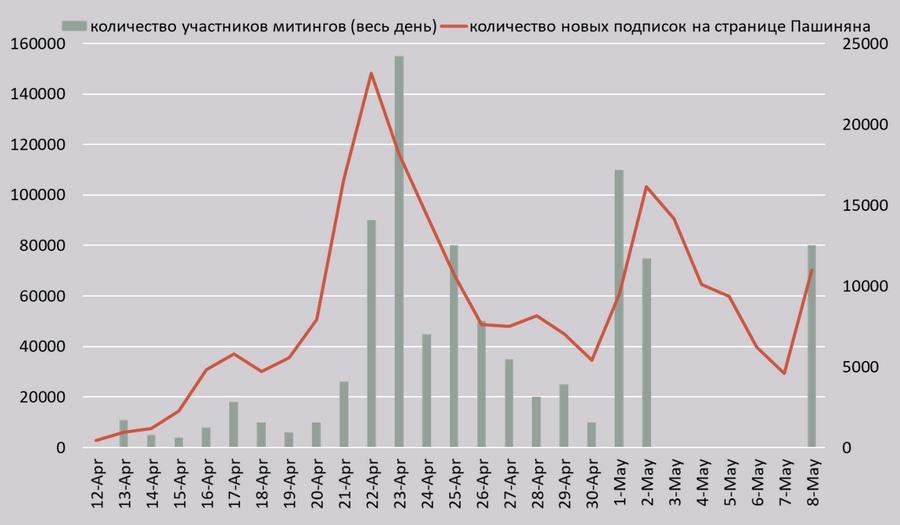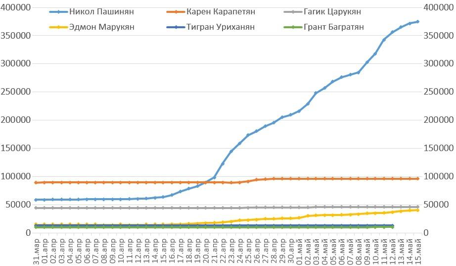 Однако вскоре началась анонсированная революция. Уже 1 апреля число лайков на странице Пашиняна возросло до 59,067, а 13 апреля, когда он провел первый митинг в Ереване составило 61,116. После 13 апреля количество лайков на его странице росло почти экспоненциально, когда уже 20 апреля он обогнал Карапетяна. По стечению обстоятельств, именно тогда власть РПА и Сержа Саргсяна уже начала всерьез шататься. На графике ниже вы как раз можете увидеть динамику числа подписок основных страниц в армянском политическом фейсбуке.