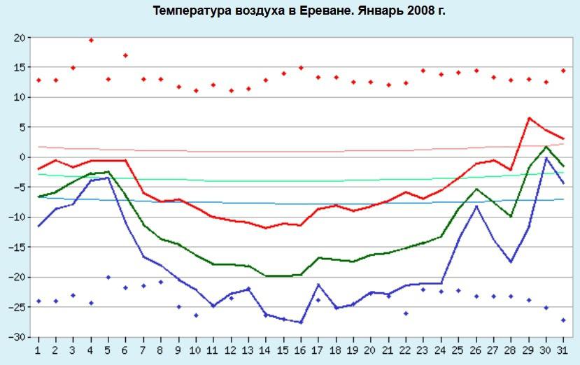 Серыми зонами отмечены периоды кризисов – глобальный экономический кризис 2008-9 гг. и кризис 2014-5 гг. на постсоветском пространстве. В обоих случаях, кризисы искажали структуру промышленности, но влияние первого было гораздо глубже, чем второго. Теперь что касается самих данных. Тонкие линии означают ежемесячные показатели – долю соответствующего сектора в структуре промышленности, выраженную в стоимости в текущих ценах (в 1998-1999 гг. – в ценах 2000 года, с 2000 года – в текущих ценах). Синим цветом, как и указано в легенде, отмечена обрабатывающая промышленность, зеленым цветом сырьевой сектор, а желтым – электроэнергетика и коммунальные услуги. Можно заметить, что тонкие линии имеют сезонные колебания. В частности, энергетика и коммунальные услуги имеют ежегодные пики на зимних месяцах, когда потребление (а, следовательно, и производство) электроэнергии растет – и проседание в летние месяцы, когда оно падает. Высота пиков относительно среднегодовых значений напрямую связана с погодными условиями и зависит от того, насколько холодной была зима. Так выделяются 2000, 2002, 2005, 2006, 2007, 2008, 2013, 2016 гг. Так, зимой 2005-6 гг. пик был в декабре – при 13-15% в летние месяцы, энергетика и коммунальные услуги достигли 27.9% в декабре 2005 года и 27.6% в январе 2006 года. А зимой 2007-8 гг. пик был в январе 2008 года: декабрь – 21.4%, январь – 33.0%, февраль – 25.9%. Что касается погоды – то в январе 2008 года была зарегистрирована температура -27.6°C, что для Еревана очень низкое значение. Ниже представлен график температур в январе 2008 года.