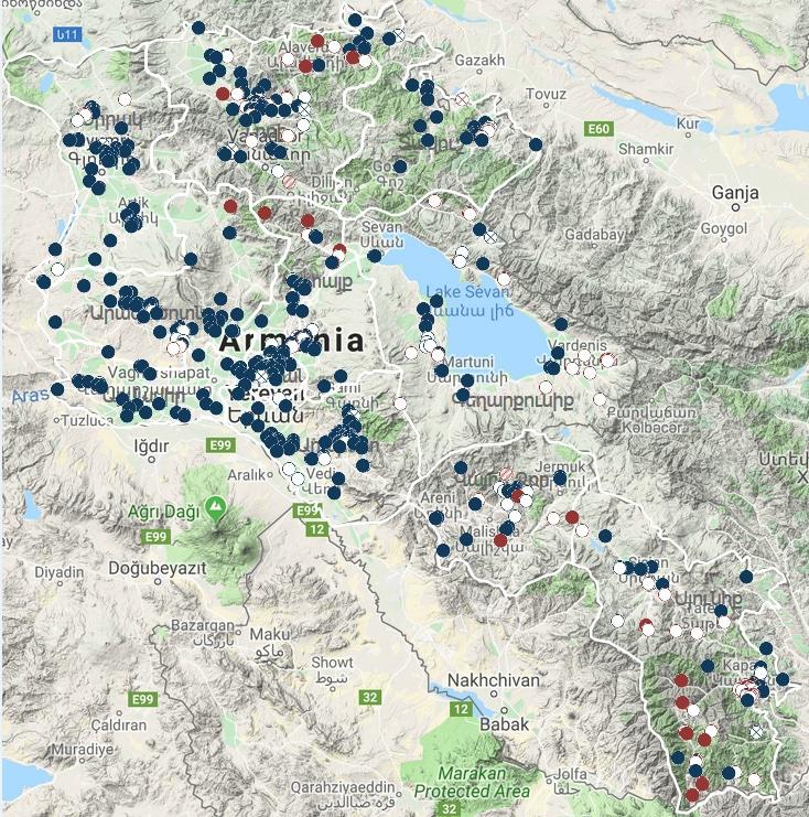 Карта всех шахт, существующих на территории Республики Армения, включая недействующие шахты. Синим цветом отмечены неметаллические, красным – металлические шахты. Источник – Transparency Armenia.