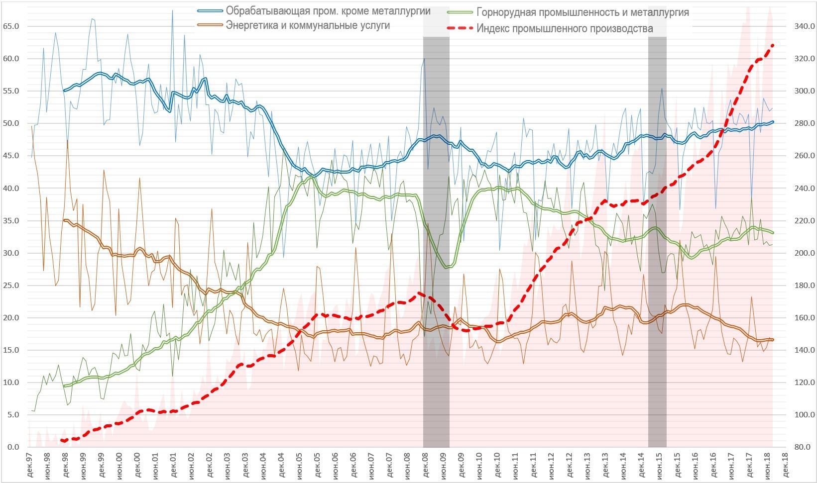 Жирной линией отмечена динамика доли трех секторов промышленности, но в отличие от прошлого раза – это не 12-месячная линейная фильтрация и не среднее скользящее за 12 месяцев в текущих ценах, а средневзвешенная динамика за 12 месяцев, что уменьшает значение зимних «пиков». Этот показатель тождественен годовому значению с тем отличием, что на графике выше он доступен с периодичностью в 1 месяц.