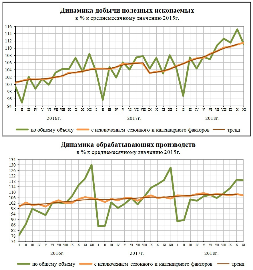 Однако пищепром зарегистрировал неплохой рост – до 5%, производство лекарств – 7.5%, автопром – до 14%, мебельная промышленность 5.5%. В то же время, к концу года предпринимательская уверенность организаций обрабатывающей промышленности начала сильно ухудшаться – с -2 в марте-июле до -8 в ноябре – самый низкий уровень с декабря 2016 года. Подробнее – см. в сборнике «Социально-экономическое положение России в январе-ноябре 2018 года».