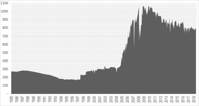 Примечание: данные с 1985 по 1993 – усредненные ежегодные; начиная с января 1994 года – ежемесячные. Источник – enerdata.net.