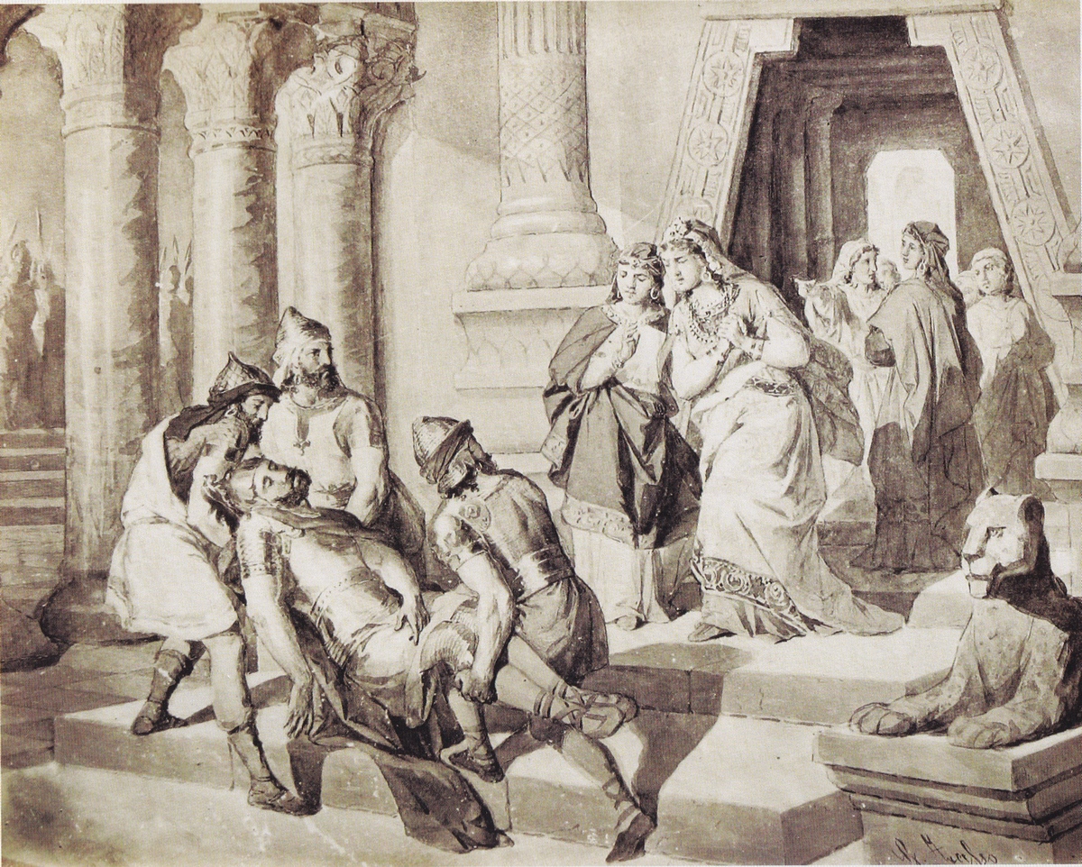 Итак, реальный царь Урарту Арам правил в 859-844 гг. до н. э., а по преданию его сын был убит Семирамидой, которая полюбила его, предложила жениться и объединить две страны, но получив отказ, напала на Армению и в битве ассирийцы убили Ара прекрасного. Речь идет о каких-то событиях конца IX века до н. э., но сложно точно сказать о каких. Впрочем, по древнеармянской хронологии, все это было на тысячу лет раньше. Этот сюжет неоднократно вдохновлял армянских художников. Один из примеров вы видите слева - это картина Ара и Шамирам Вардгеса Суренянца (1899 г.).