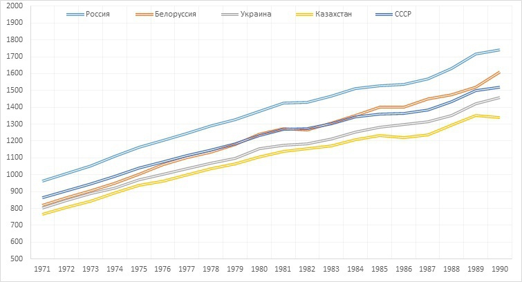 Годовое потребление в союзных республиках составляло около 1000-2000 рублей на человека, по советским национальным счетам, примем еще по 1000 в качестве компенсации недоучета тени и методологической поправки на промежуточное потребление (в советских национальных счетах использовался показатель «национальный доход», а не «национальный продукт», первый меньше второго примерно на треть).