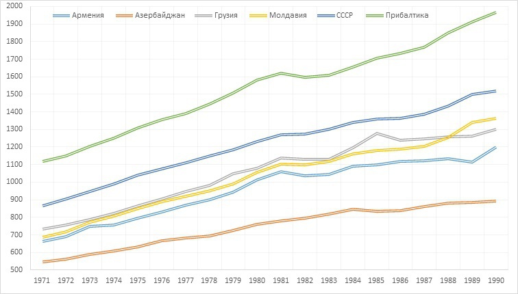 Кавказ имел одно важное отличие и от Прибалтики, и от славянских республик. На Кавказе, особенно в Грузии и Азербайджане, был большой теневой сектор, который вообще не фиксировался в производстве и не полностью фиксировался по потреблению. См.
