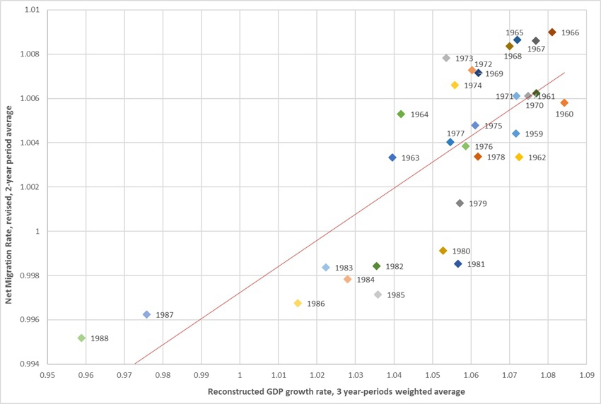 На этом графике я показываю взаимозависимость экономической динамики (извлеченной из официальной советской статистики) и миграции в Советской Армении. Учитывая высокую корреляцию (около 80%) и сравнительно близкое к тренду попадание точек, мы получаем доказательство того, что принципиально теневой экономикой реальная экономическая ситуация не искажалась. Это построение основано на моей модели, примененной для современной Армении: