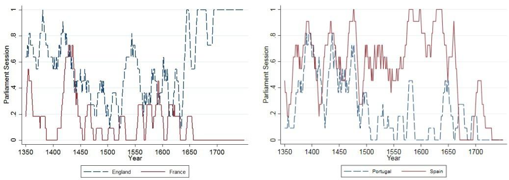 Рис. 2. Динамика активности парламента в Англии, Франции, Португалии и Испании в 1350-1700 гг.