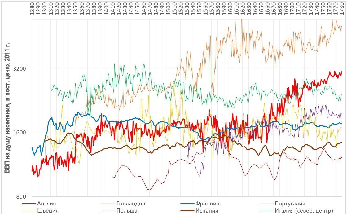 Источники данных – Maddison Project database (2018); Broadberry, Campbell, Klein, Overton and van Leeuwen. 2015. British Economic Growth, 1270-1870. Cambridge University Press. Cambridge; van Zanden, Jan Luiten, and Bas van Leeuwen. 2012. ‘Persistent but not consistent: the growth of national income in Holland 1347–1807’, Explorations in Economic History, 49 119–30; Malanima, Paolo. 2011. The long decline of a leading economy: GDP in central and northern Italy, 1300-1913, European Review of Economic History, 15 169-219; Alvarez-Nogal, Carlos and Leandro Prados de la Escosura. 2013. ‘The rise and fall of Spain (1270-1850).’ Economic History Review 66(1) 1-37; Schön, Lennart and Olle Krantz. 2012. The Swedish economy in the early modern period. Constructing Historical National Accounts 1560-2000, European Review of Economic History 16 529-49; Palma, Nuno, and Jaime Reis. 2014. ‘Portuguese demography and economic growth, 1500-1850.’ Paper for “Accounting for the Great Divergence” Conference. The University of Warwick in Venice. См. также Max Roser, Economic Growth, Our world in Data.
