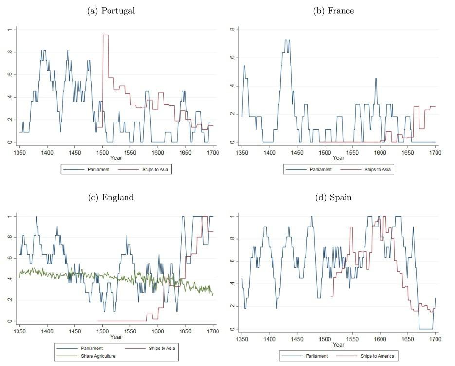 На графике ниже представлена динамика активности европейских парламентов и дальней торговли (количество кораблей, отправляющихся в Азию и Америку).