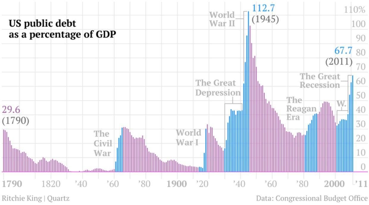 Источник – Theatlantic.com (Matt Phillips, The Long Story of U.S. Debt, From 1790 to 2011, in 1 Little Chart).