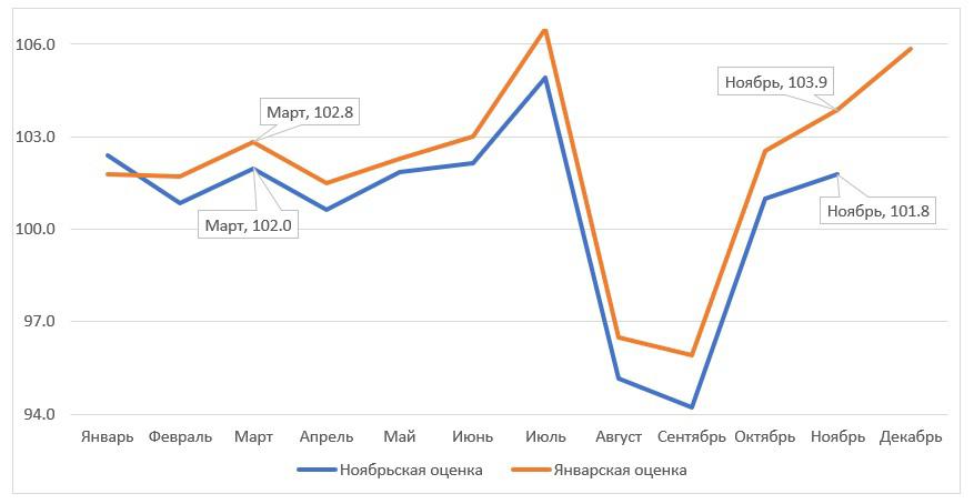Показатель экономической активности с сезонной корректировкой также постоянно пересматривается. Все, конечно, возможно, и любой показатель нужно пересматривать. Но невозможно постоянное и серьезное изменение показателей с сезонной корректировкой, когда текущие показатели пересматриваются довольно мало. Потом, любая сезонная корректировка производится на основе какой-то модели и на основании трендов за определенное число лет. Нельзя ровно каждый месяц менять модель и потом называть это статистикой. В частности, сезонность определяются на основе показателей, зафиксированных до отчетного периода, а не в течение его. Поэтому пересмотр темпов роста возможен только на основе изменений показателей, зафиксированных за отчетный период, а не изменения модели. А этот пересмотр подразумевает именно изменение модели. По оценке на основе данных ноября 2018 года, в ноябре объем выпуска с исключением сезонного фактора все еще был ниже, чем в марте, а последней оценке он уже был выше на 1.1%. Похоже на то, что сделал Росстат, когда оказалось, что в 2016 году был не спад, а рост. На графике видна динамика (за 100 единиц принят показатель за декабрь 2017 года).
