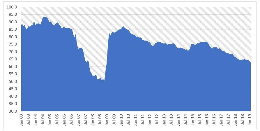 Есть, однако, один тренд, который серьезных сомнений не вызывает. Это дедолларизация армянской экономики. Ее можно оценить на основе данных о счетах, все большая доля которых номинирована в драмах. На конец февраля, уже 37.1% всех средств на депозитах номинировано в драмах – и 37.1% - в иностранной валюте (преимущественно – в долларах). Это самый лучший показатель за 10 лет, хотя до глобального кризиса 2008-2010 гг. показатели были, разумеется, лучше. На графике ниже представлен показатель долларизации армянской экономики (доля депозитов в иностранной валюте от всех депозитов).