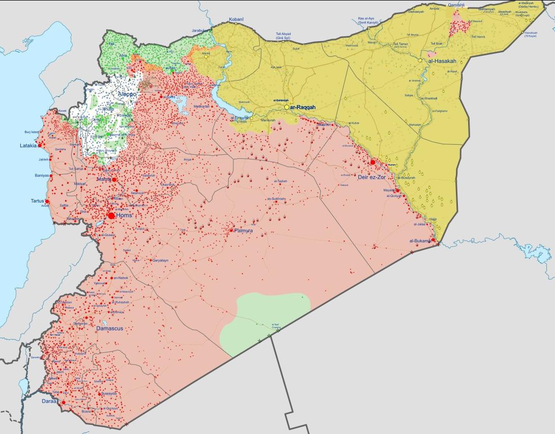 Самая свежая на данный момент политическая карта Сирии выглядит следующим образом: