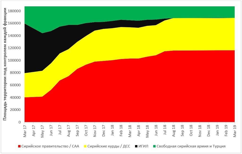 Представляю график динамики контроля над территорией Сирийской Арабской республики, с периода когда еще ИГИЛ был крупнейшей фракцией. Данные, использованные для составления - взяты с сайта syriancivilwarmap.