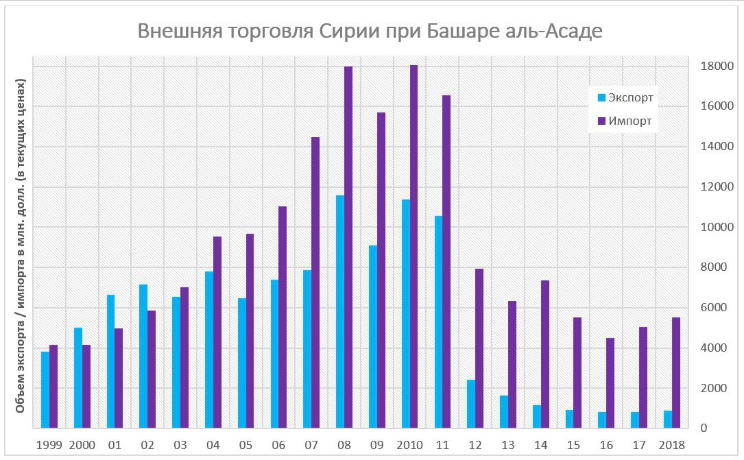 Впрочем, касательно графика - надо его как-то прокомментировать в вопросе цифр. На сегодня экспорт составляет лишь 7.7% от пикового значения в 2008 году. За один лишь 2012 год экспорт из Сирии сократился на 77% или в 4-5 раз. Перспектив восстановления особенно не видно. В то же время, импорт сократился не так сильно. В 2018 году импорт составлял 30.8% от уровня 2008 года, сокращение за 2012 год составило 52%. Если ассоциировать импорт с потреблением (а это, скорее всего, так), и учесть что до четверти населения покинуло страну за время войны, то можно заключить, что подушевой уровень жизни упал на 55-60%, что, однако, не так сильно, как после распада СССР, к примеру, в Армении. Следует также учитывать, что на территориях, не затронутых войной, таких как Тартус, Латакия, или частично затронутых войной, таких как Хама, Хомс, Дамаск, упадок не столь значителен, как в регионах, которые находились и тем более до сих пор находятся под контролем оппозиции.