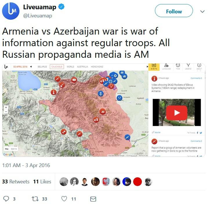 3 апреля на официальном твиттере портала опубликовано сообщение следующего содержания: Armenia vs Azerbaijan war is war of information against regular troops. All Russian propaganda media is AM (Война Армении против Азербайджана это война информации против регулярных войск. Все российские пропагандистские СМИ на армянской стороне). Скриншот - ниже.