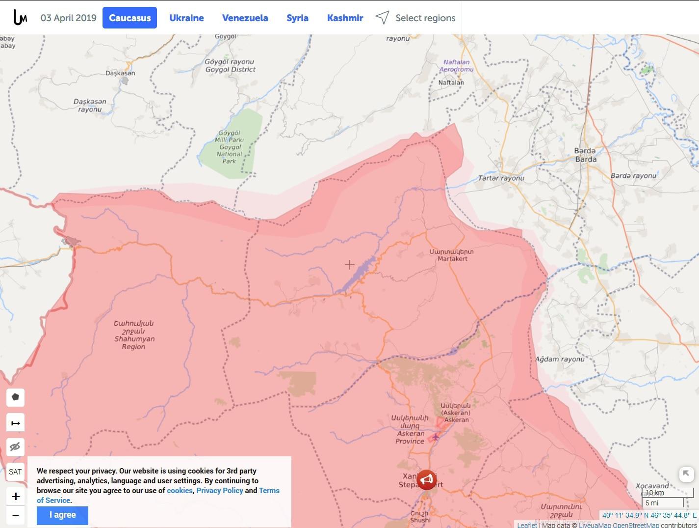 Здесь авторы сайта инвертировали свое извращенное понимание своей войны в Украине на Кавказ. Не понимая в реалиях Южного Кавказа ничего, они представляют Карабахскую войну как гибридную, в которой на одной из сторон сражаются российские СМИ. Плюс, они показывают войну как противостояние Республики Армения с Азербайджаном, хотя это по меньшей мере не совсем так. Напомню, что в Карабахской войне 1992-94 гг. из идентифицированных погибших с армянской стороны около 60% были родом из Карабаха, хотя его население в 20 раз меньше, чем Армении. Кроме того, они явно поддержали одну из сторон - то есть Азербайджан. Их заявление о том, что на стороне Армении "сражаются" российские пропагандистские СМИ ничего не говорит ни об Армении, ни о российских СМИ, а говорит только о самом сайте Liveuamap.com - и его продукте - карте конфликта. Заявление абсолютно созвучно и азербайджанским пропагандистским тезисам, и вообще является пропагандистским по форме. Вырежем собственно карту противостояния из этого твита.