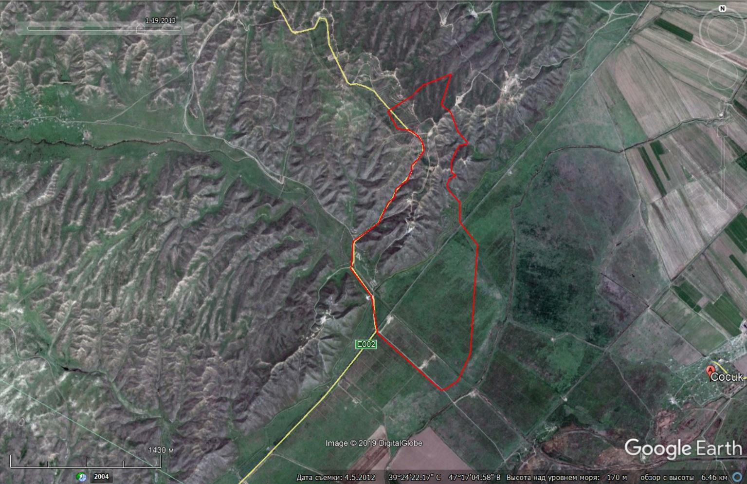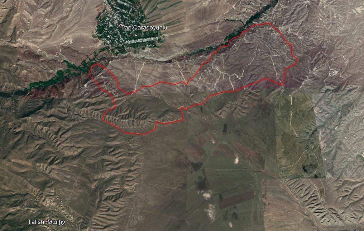 Рассмотрим географические параметры занятой Азербайджаном территории. Если я указал его периметр верно, то она составляет 2.1 кв. км. (210 га), а периметр - 7.7 км. В ширину этот участок составляет от 300 до 1200 м., а в длину - до 3 км. Высота этого участка достигает 250 м. над уровнем моря, это высота холма, а равнина вокруг имеет высоту от 150 до 180 м., то есть непосредственно высота холмов составляет около 80 м. Рассмотрим этот участок в еще большем приближении.