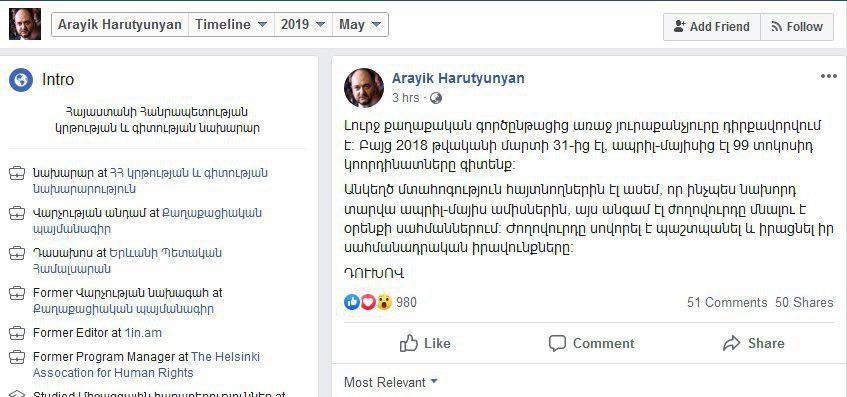 Сегодня Никол Пашинян, вслед за решением суда по делу Роберта Кочаряна (см. Внутренняя политика Армении, апрель-май 2019), призвал всех собираться завтра вокруг судов и блокировать их деятельность. И так было понятно, что власть восприняла смену меры пресечения как собственное поражение. Я уже сказал, что «на протяжении последней недели на всю катушку раскрутилась пропаганда ненависти, концентрированно идущая с самого верха. Власть мобилизовала людей на проведение якобы спонтанных акций протеста против освобождения Кочаряна, идет пропаганда ненависти против Карабаха и властей Карабаха идет пропаганда ненависти против АРФ «Дашнакцутюн» и уже прошло несколько нападений, в том числе на бывшего лидера «Дашнакцутюн» Гранта Маргаряна, который вчера гулял с детьми, а также на участников прокочаряновской акции протеста».