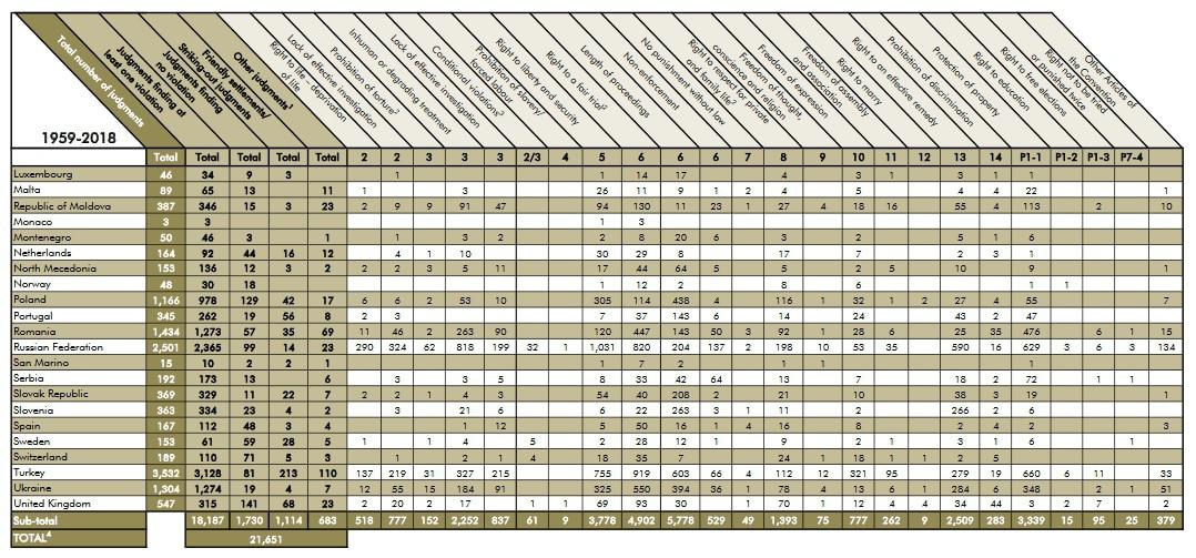 В своем заявлении он говорит о vetting-е, то есть по сути хочет внедрить институт комиссаров, прикрепить их к судьям и визировать их правовые решения. Учитывая отсутствие каких бы то ни было квалификаций о том, что в прошлом массово нарушались права человека любыми международными структурами, обоснование под требованием к переходному правосудию ничтожно. Но поскольку как-то надо обосновать, он говорит о решениях ЕСПЧ, никак не подтверждая слова. Но по поводу голословных утверждений премьер-министра, приведу статистику самого ЕСПЧ.