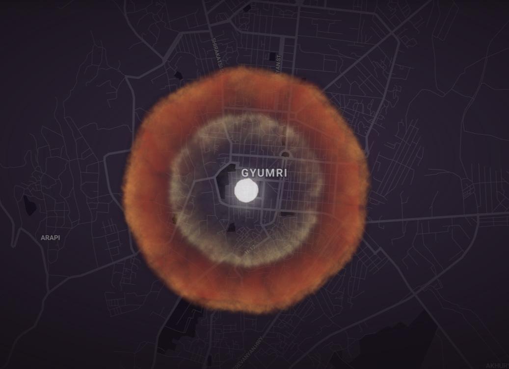 Начнем с Еревана. Огненный шар охватит площадь 1.12 кв. км., или 112 га, то есть примерно треть малого центра Еревана. Ударная волна охватит площадь в 70 кв. км., или большую часть города, а тепловая волна – площадь в 161 кв. км., то есть практически весь Ереван. Предположительное число жертв составит 424 тысячи человек убитыми и 463 тысячи раненых. Город будет полностью уничтожен, но жертвы не будут исчерпываться Ереваном, разумеется, да и в Ереване погибнут и пострадают не все. Кроме того, подозреваю, что симулятор не учитывает рельеф, который в Ереване очень пересеченный и вряд ли позволит случиться такому большому числу жертв. С другой стороны, компактность Еревана и его круглая форма, делает его очень уязвимым для таких ударов.