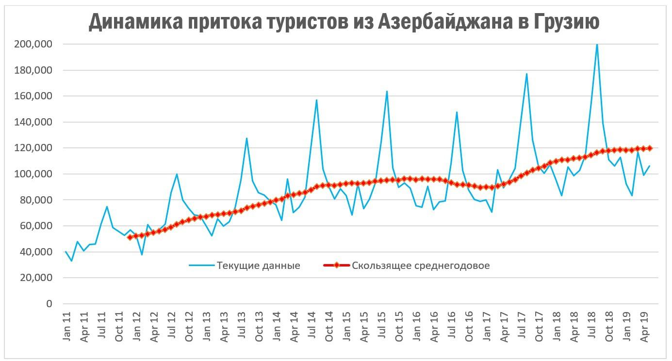 В последние годы фиксировалась тенденция роста притока россиян как посредством наземного транспорта, так и посредством авиатранспорта. Наземный транспорт имеет определенные ограничения, которые в прошлом году были исчерпаны. Ради этого была даже введена ограничительная мера по транзиту пшеницы через грузинские автодороги. (см.: Запрет транзита пшеницы через грузинские автодороги - причины принятия, последствия для Армении, статистика пшеницы). Поэтому, несмотря на рост доли россиян во въездном потоке, количество вырасти уже практически не может; еще в июле 2018 года на границе между Россией и Грузией выросла огромная «пробка», во многом благодаря армянским грузовикам, а в 2019 году «пробка» создалась уже к началу мая. При этом, рост уже практически прекратился. Это означает, что физическая пропускная способность КПП «Верхний Ларс»/«Казбеги» теперь уже исчерпана даже на весенний период, а не только летний и зимний. У нас есть данные по апрелю.