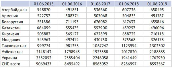 Как оказывается, число граждан Армении на территории России за последние 4 года лишь сокращалось, а не росло. В отличие от граждан Азербайджана, которое, напротив, росло, на протяжении последних 4 лет – и довольно быстро. Общее число граждан СНГ, находящихся в России в период с июня 2017 по май 2018 года, снизилось, а с июня 2018 по май 2019 – напротив выросло. Это хорошо согласуется с трудовой статистикой России, но плохо согласуется с миграционной, поскольку число граждан Украины в России только сократилось за последний год, также, как и граждан Армении, а вот что касается граждан Узбекистана, Кыргызстана, Казахстана, Таджикистана и Беларуси, то мы видим рост.