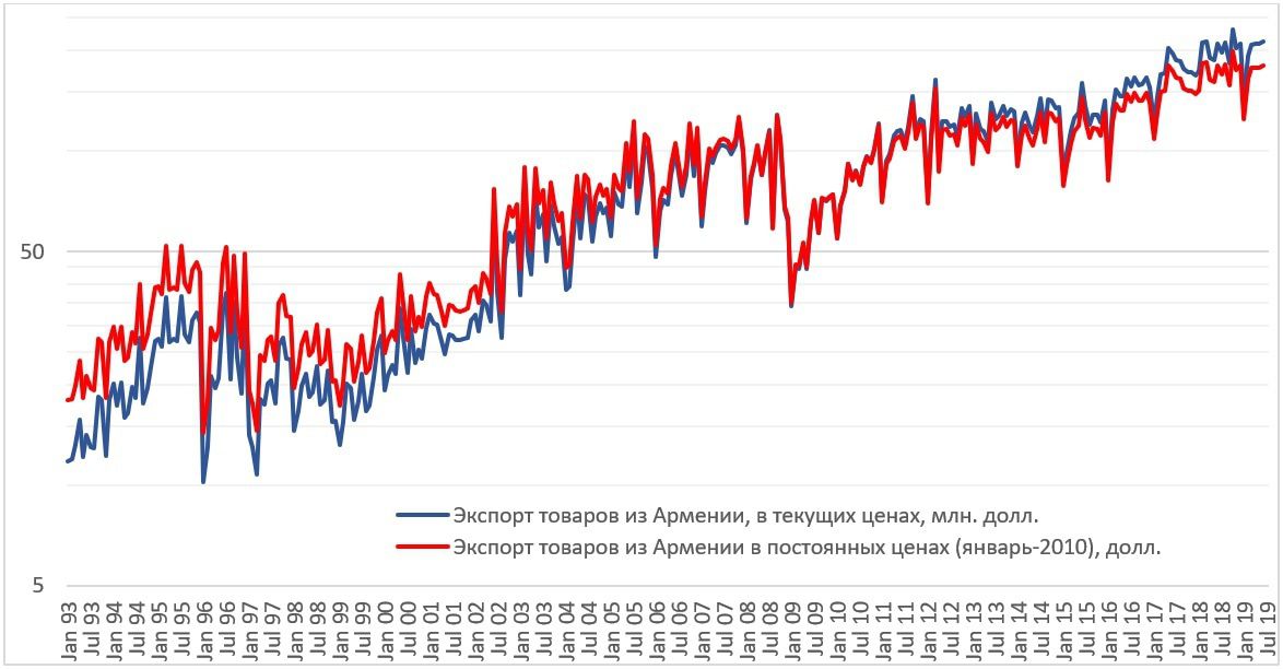 График 4. Динамика экспорта Армении в текущих / постоянных ценах (в млн. долл., логарифмическая шкала)