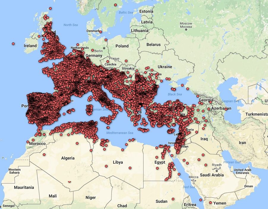 На карте ниже – местонахождение всех найденных латинских надписей (скриншот с интерактивной карты).