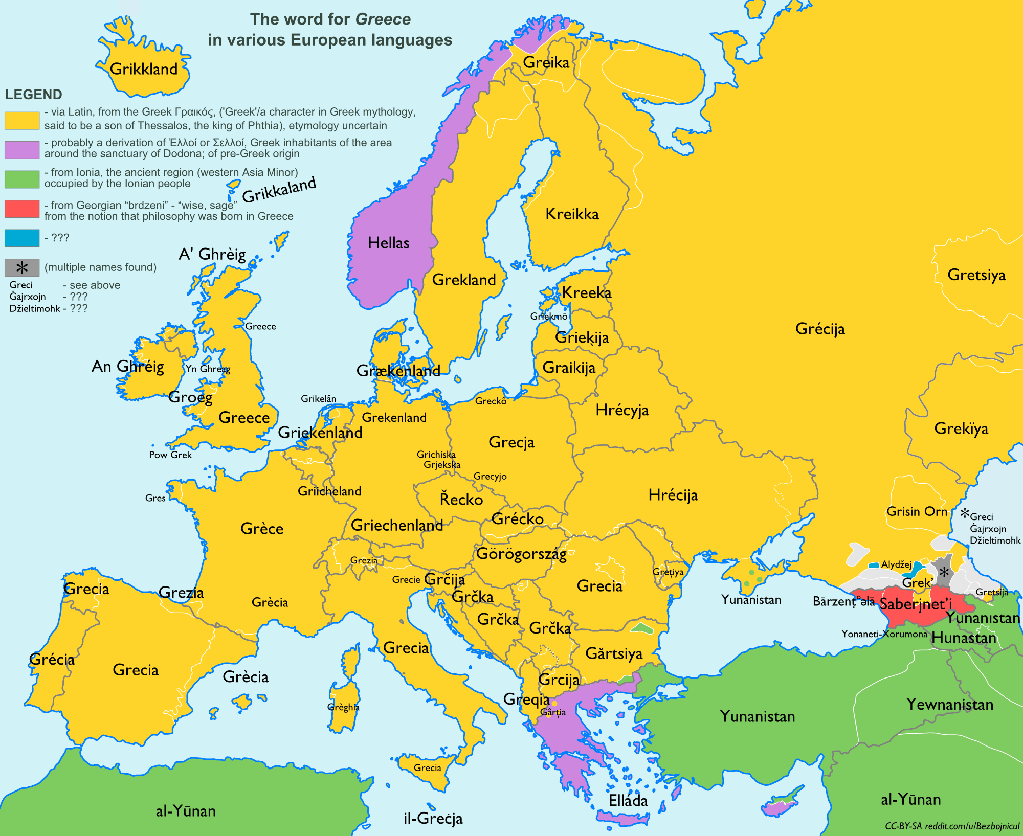 Приведу ряд примеров. В 484-6 гг. до нашей эры на территории Ванской крепости (историческая Армения, в Турции), появилась надпись Ксеркса, который утверждал, что его отец (Дарий I Ахеменид) хотел сделать там надпись, но не успел. Эта надпись – единственная царская надпись Ахеменидской империи вне Ирана, что демонстрирует какое значение играла Армения в империи. На карте ниже можно увидеть то, как название Греции звучит на разных языках Европы и смежных областей.