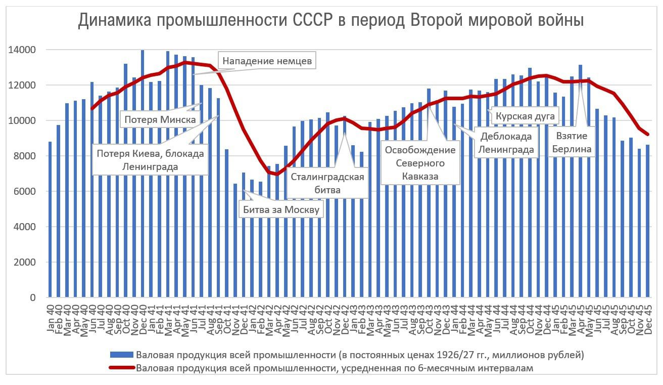 Меня также заинтересовали данные по динамике промышленности СССР в годы Второй мировой войны. Во-первых, доступны ежемесячные данные, а это всегда интересно. Во-вторых, как мы видели, в период с 1941 по 1945 гг. в СССР гораздо меньше фальсифицировали статистические данные и официальные данные довольно близки к истине. Поэтому они вдвойне интересны. Наконец, можно попробовать их наложить на основные вехи войны и посмотреть, как война влияла на советскую промышленность. А влияние это определенно должно быть, поскольку выше мы уже видели, как сильно вырос сектор «А» за счет ВПК в годы войны.