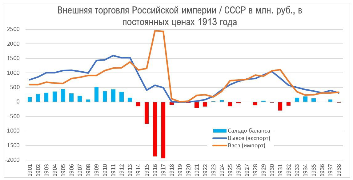 После революции СССР перешел к автаркии. На основании книги Бакулина «Статистика внешней торговли (СССР и мир) от 1940 года, я вычислил динамику внешней торговли за весь период с 1901 по 1938 год.