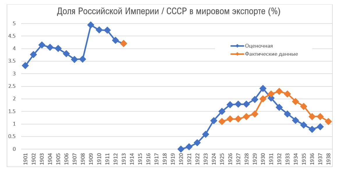 К сожалению, данные, которые предоставляет Бакулин по доле СССР/Российской империи в мировом экспорте, неполны, поэтому я попытался восстановить динамику для других годов. Эта реконструкция приблизительна, но для тех годов, по которым есть фактические данные, она не очень сильно отклоняется от реальности.