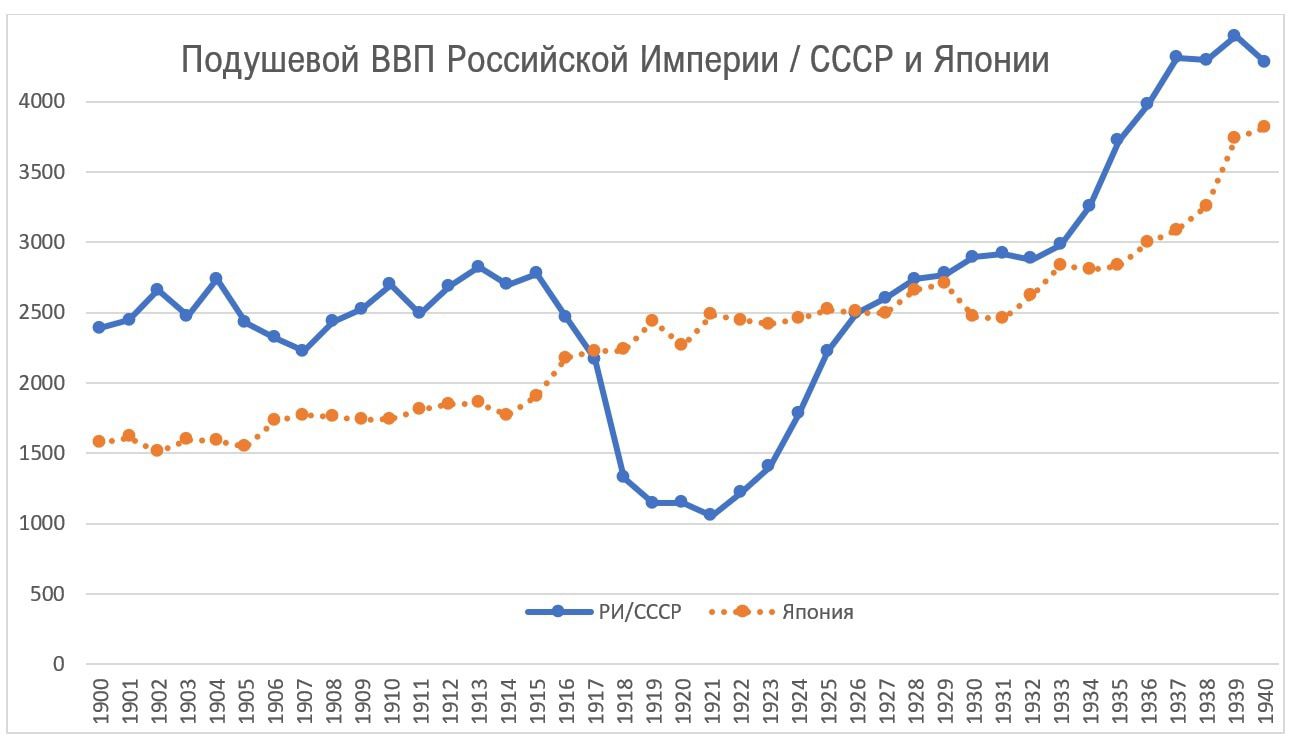 График 1. Динамика ВВП на душу населения Российской империи / СССР и Японии (для сравнения)