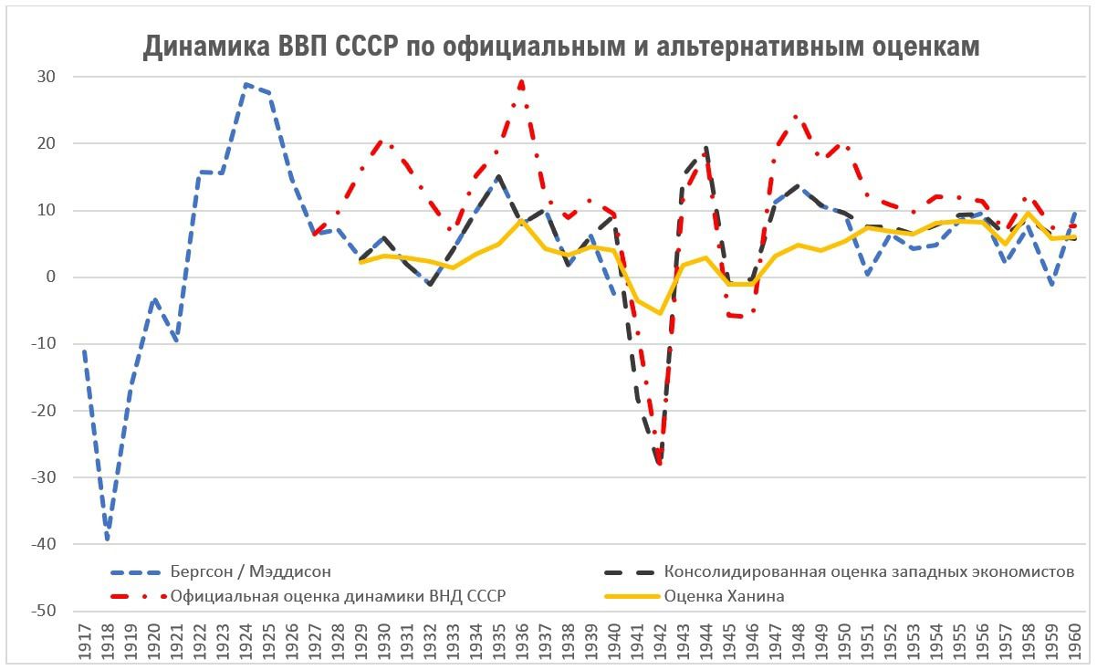 На графике ниже вы можете увидеть отличия между официально публикуемыми и альтернативными оценками динамики советской экономики.
