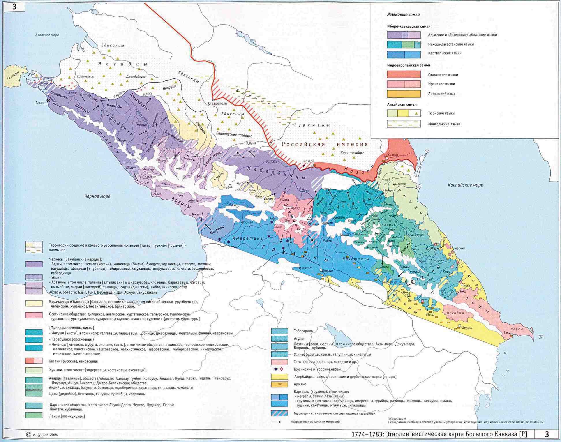 Ниже приведена карта этнического состава населения Северного Кавказа на конец XVIII века под авторством Артура Цуциева